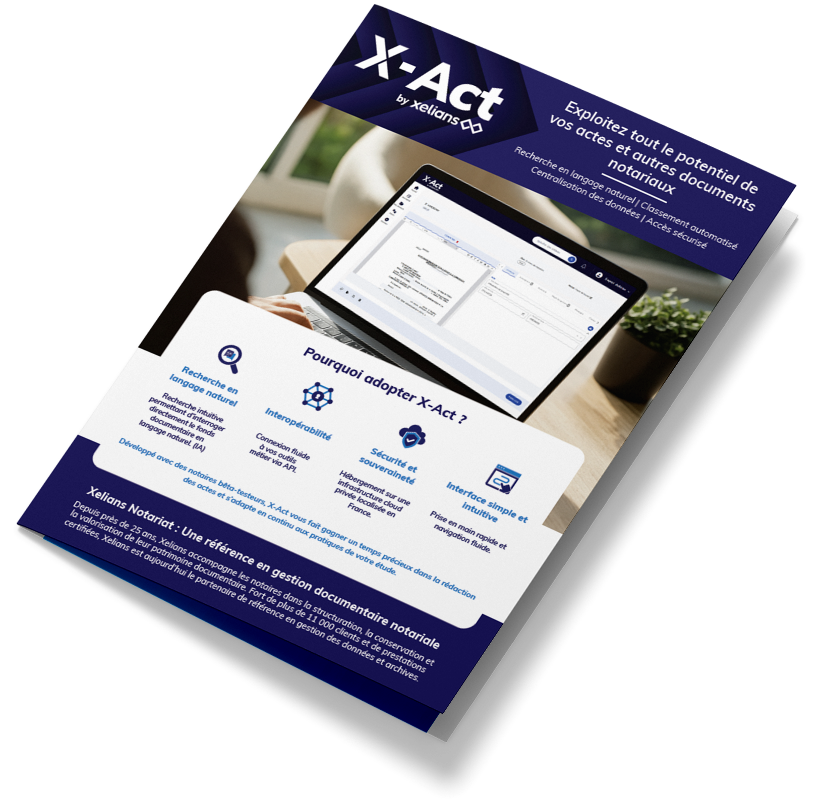 X-Act, solution SaaS souveraine conçue pour les offices notariaux, a justement été pensée comme un levier pour redonner clarté, structure et maîtrise à ce patrimoine documentaire au cœur de votre activité.